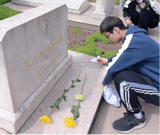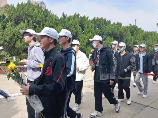 上午八点半,全体学生手捧菊花,从北门向烈士陵园出发。进入陵园,龙柏环绕,红旗飘飘,革命先烈纪念碑顶端的五角星格外夺目,还有那碑体正面周恩来总理的题词“革命先烈永垂不朽”无不在提醒着大家此行的目的。
