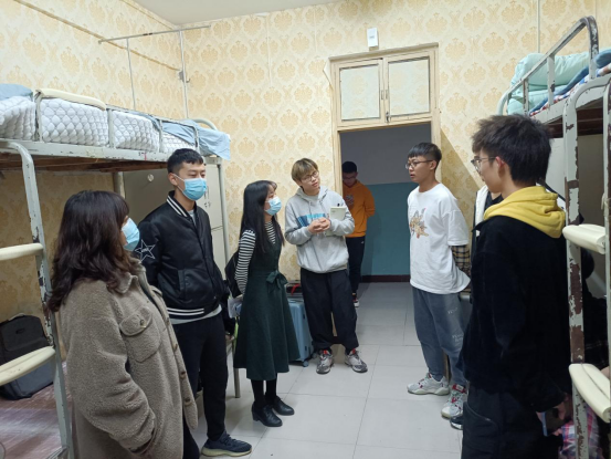 当推开南九330宿舍的门时,走访人员被眼前的一幕所吸引:六张桌子桌面整洁——一部手机、一本教材、一本笔记,宿舍六人正整齐地坐在桌子前安静地学习,宿舍地面卫生干净,床上被褥叠放整齐。王书记问同学们:“你们昨天才刚到学校,都在学什么啊?”一个同学回复道:“看的直播回放,明天就要开始线下上课了,怕自己跟不上进程,再温习一下。”王书记勉励道:“作为大一新生,刚报到就能有这样的学习状态,实属不易,希望同学们能继续保持!。”